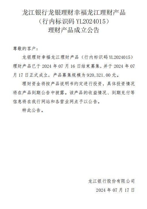 龙江银行(YL2024015)2024年07月17日理财产品成立公告