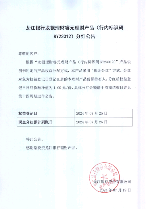 龙江银行龙银理财睿元理财产品(行内标识码RY23012)分红公告