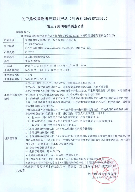 关于龙银理财睿元理财产品(行内标识码RY23072)第三个周期相关要素公告