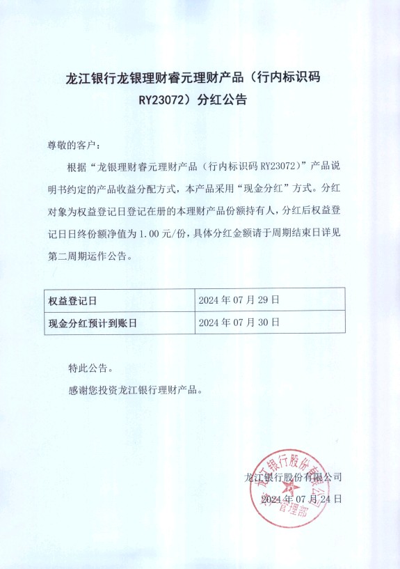 龙江银行龙银理财睿元理财产品(行内标识码RY23072)分红公告