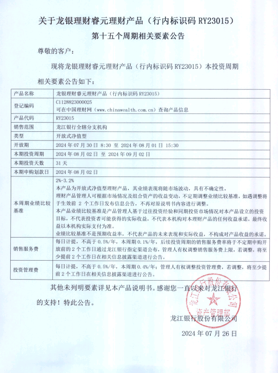 关于龙银理财睿元理财产品(行内标识码RY23015)第十五个周期相关要素公告