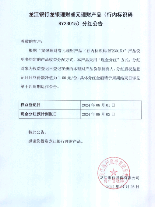 龙江银行龙银理财睿元理财产品(行内标识码RY23015)分红公告