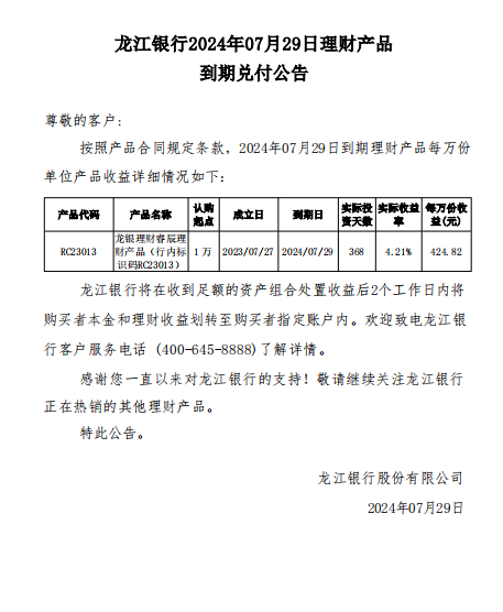龙江银行2024年07月29日理财产品到期兑付公告