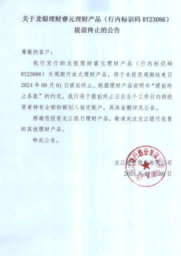 关于龙银理财睿元理财产品(行内标识码RY23086)提前终止的公告