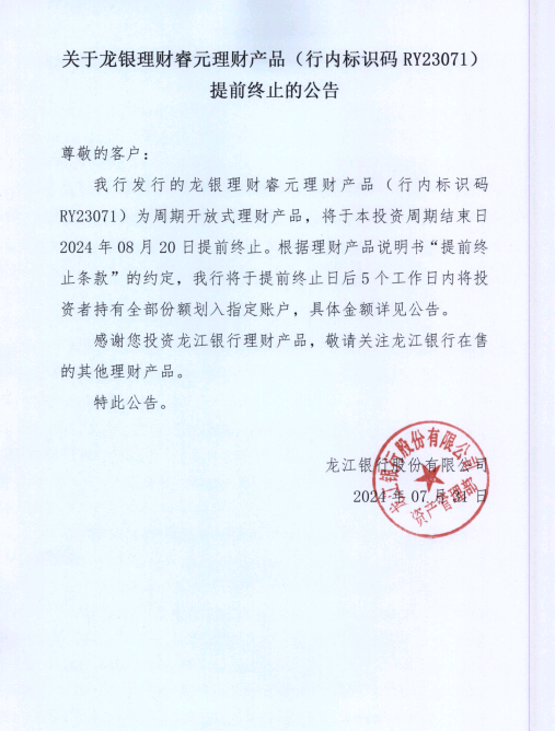 关于龙银理财睿元理财产品(行内标识码RY23071)提前终止的公告