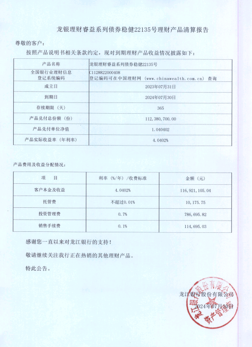 龙银理财睿益系列债券稳健22135号理财产品清算报告