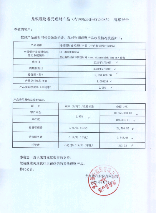 龙银理财睿元理财产品(行内标识码RY23085)清算报告