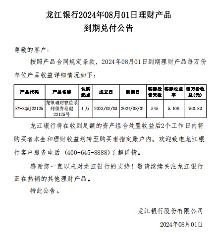 龙江银行2024年08月01日理财产品到期兑付公告