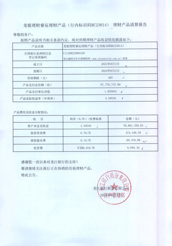龙银理财睿辰理财产品(行内标识码RC23014)理财产品清算报告