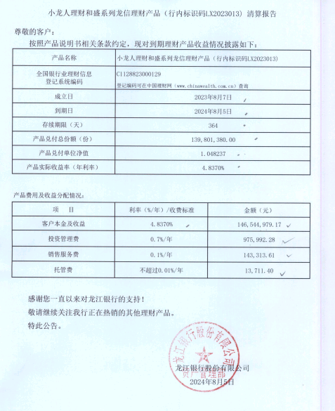 小龙人理财和盛系列龙信理财产品(行内标识码LX2023013)清算报告