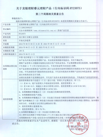 关于龙银理财睿元理财产品(行内标识码RY23075)第三个周期相关要素公告