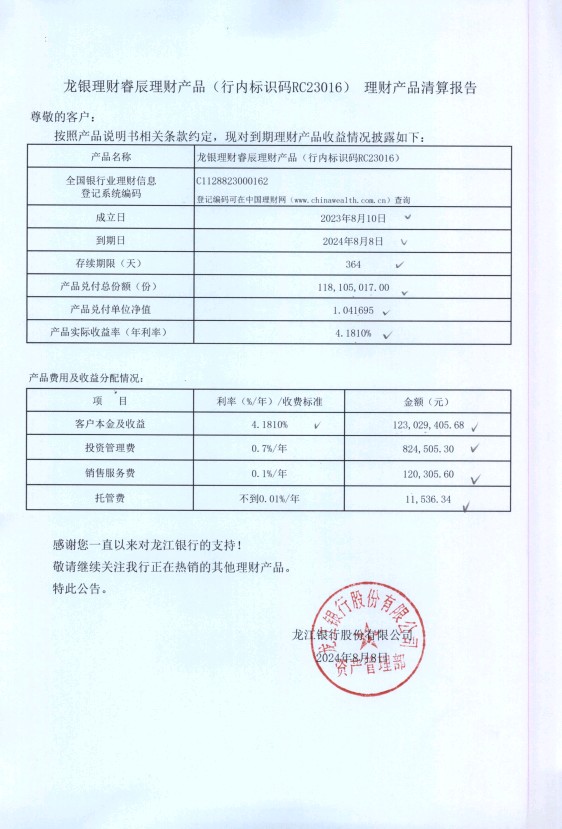 龙银理财睿辰理财产品(行内标识码RC23016)理财产品清算报告