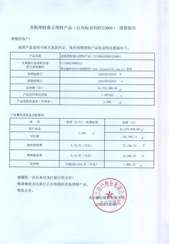 龙银理财睿元理财产品(行内标识码RY23066)清算报告