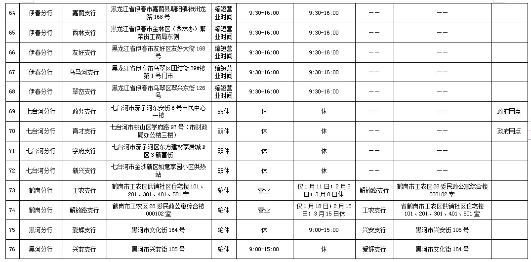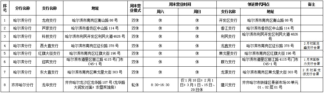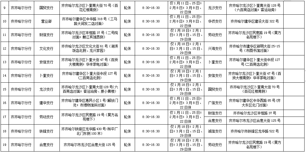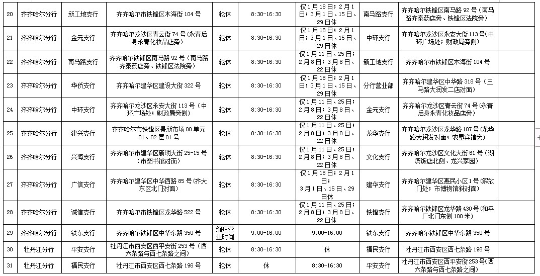 为优化网点服务资源配置,提升运营效率与服务质量,根据国家相关规定及我行实际运营情况,经报备监管部门,我行决定对部分营业网点实行轮休安排,现将具体轮休安排公告如下:
