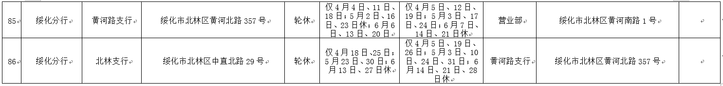 2.轮休期间,您可选择就近营业网点办理业务,或通过我行手机银行、网上银行、ATM机等自助渠道办理存款、转账、缴费等业务,足不出户享受便捷金融服务。